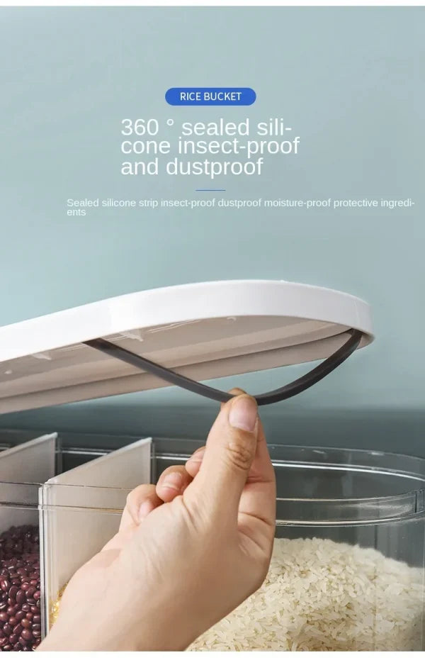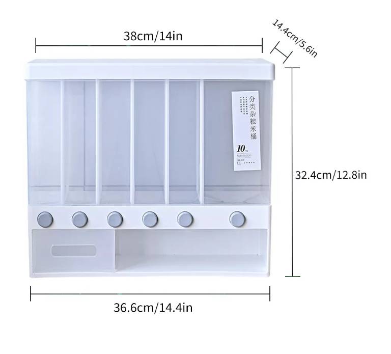 - Feature: It has 6 grids, you can divide different grains, or You can also remove the separating plate and it can be used to store all the same grains, such as rice and soybeans.square buttons, simple and beautiful appearance.