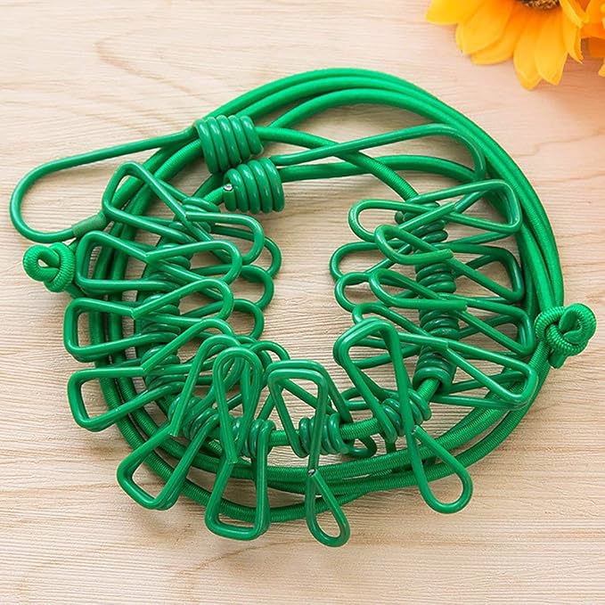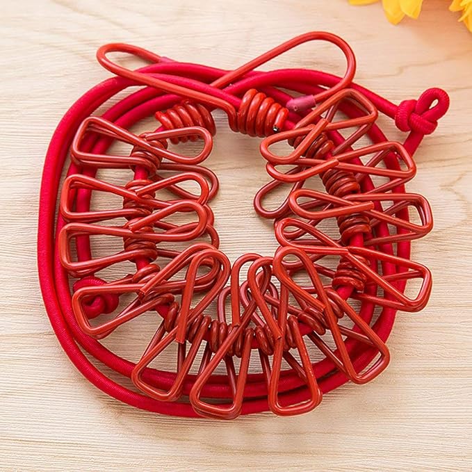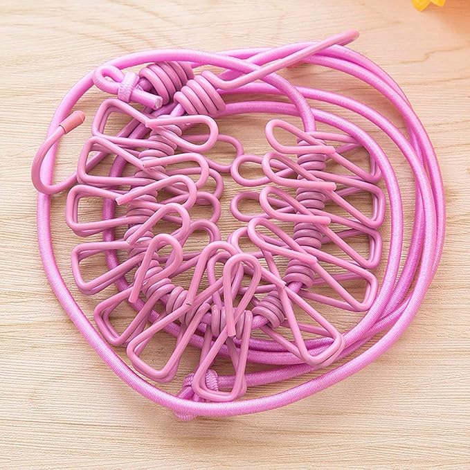 Specification:Color: Pink, Black, Red, Purple, Blue, Pink Pink.Material: PP and iron wireSize: 5.5 x 1.8 cm.Package includes:1 x Clothesline with clips.