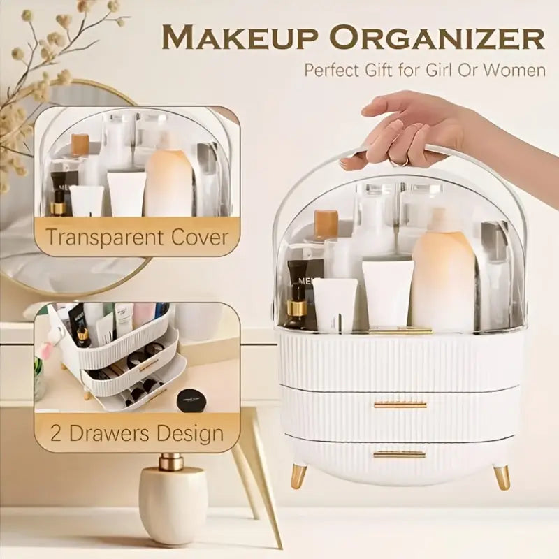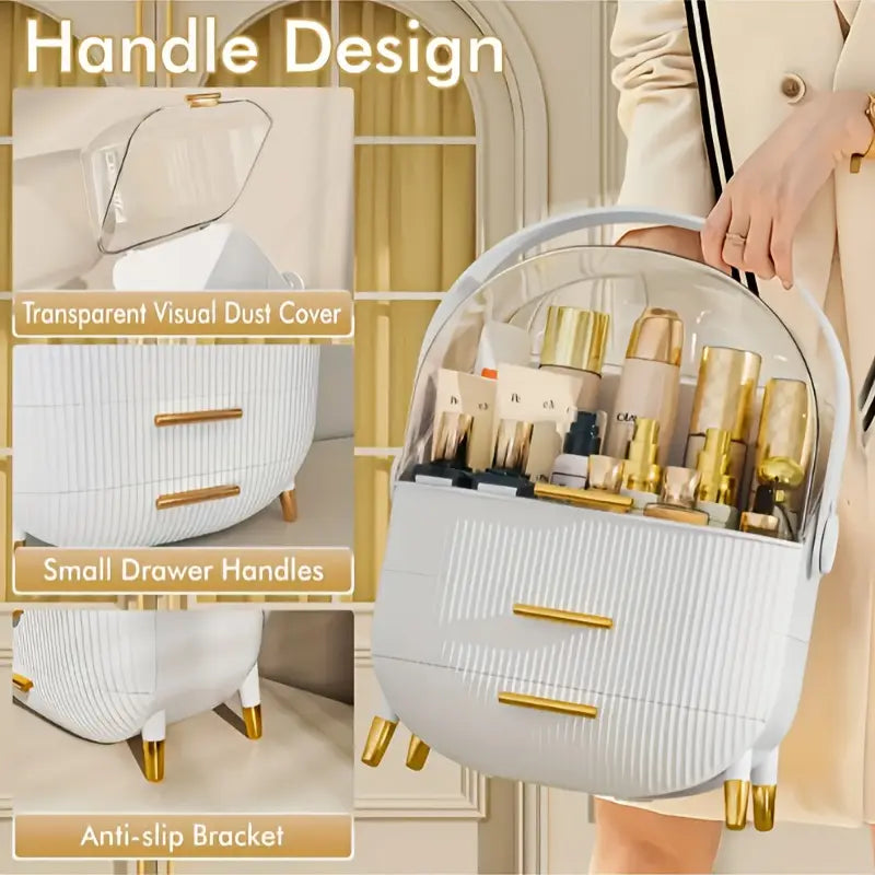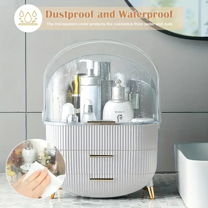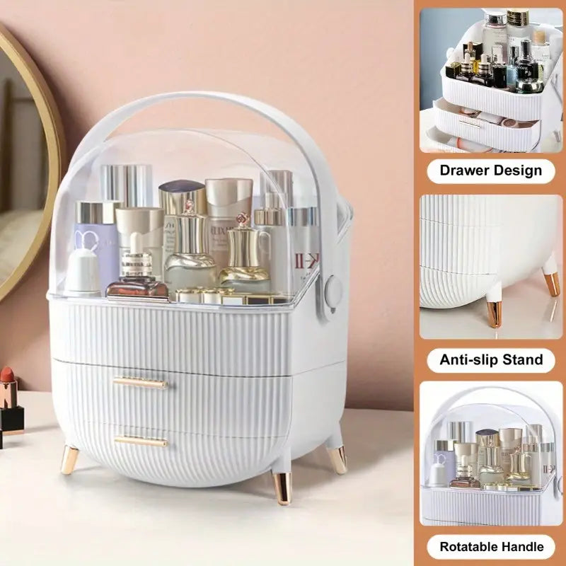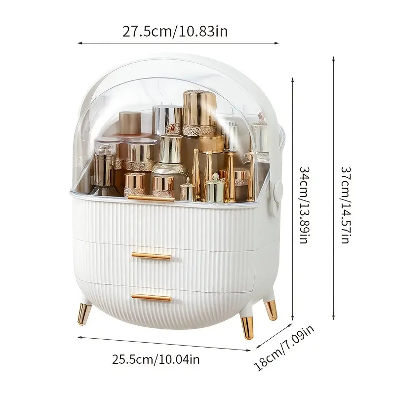 Elevate your vanity game with this luxurious, multi-functional beauty organizer—designed to keep your skincare, makeup, and essentials neatly stored and beautifully displayed. Featuring a sleek dust-proof cover, spacious compartments, and a modern aesthetic with golden accents, it not only protects your products but adds a touch of elegance to your space. With rotating side drawers, deep lower storage, and a crystal-clear dome top, this organizer makes it easy to access everything you need while keeping your countertop clutter-free. Perfect for any beauty lover who values both style and practicality.